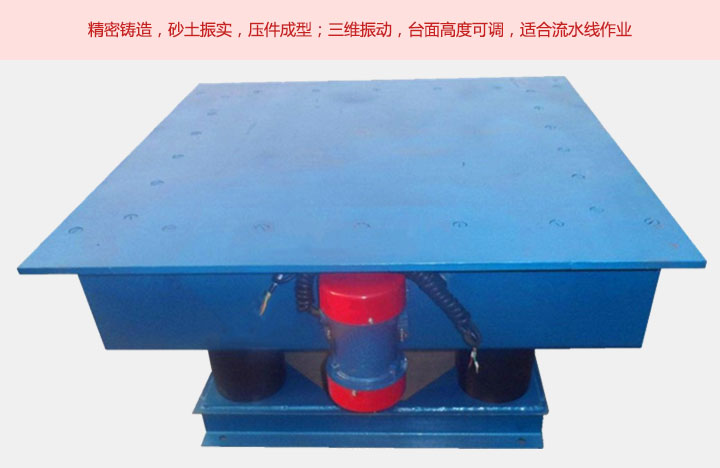 鑄造用振動平臺采用橡膠彈簧和6臺-8臺振動電機(jī)組合,具有上下,左右前后的三維振實效果,它具有多結(jié)構(gòu)支撐,結(jié)構(gòu)牢固,密封性好,性能可靠,操作簡單,振動頻率可調(diào)等特點。